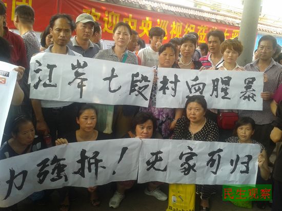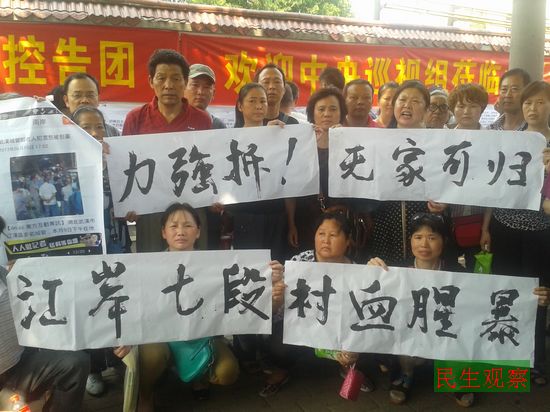 民生观察工作室2013-6-15消息:自中央第二巡视组来到湖北的消息6月3号官媒报道后,武汉市很多市民称打通了电话反映情况,巡视组要求寄材料去。更有武汉市硚口区太平洋小区居民说今天6月15日下午会有巡视组来人,到太平洋拆迁维权交流中心来“微服私访”,消息传了好多天,很多市民很兴奋很期待。于是今天下午来自武汉三镇的市民们聚集在太平洋公交车站人行道上,一时间人声鼎沸,墙上的红色横幅“欢迎中央巡视组”特别耀眼。不少人用喇叭控诉演讲,更多被侵权有诉求的访民在此用横幅布标图片表达他们的诉求,维权活动约14点开始一直持续到16点多。