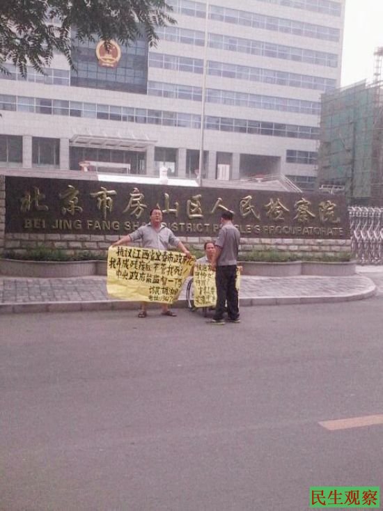 昨天下午三点左右,维权人士肖青山和胡湘银一起来到北京市房山区检察院,借此“宝地”抗议宜春市当局不顾残疾人死活,要求中央政府对此进行监督。而就在此前的7月10号,肖青山和胡湘银曾到湖北省高级法院进行过类似的抗议活动。