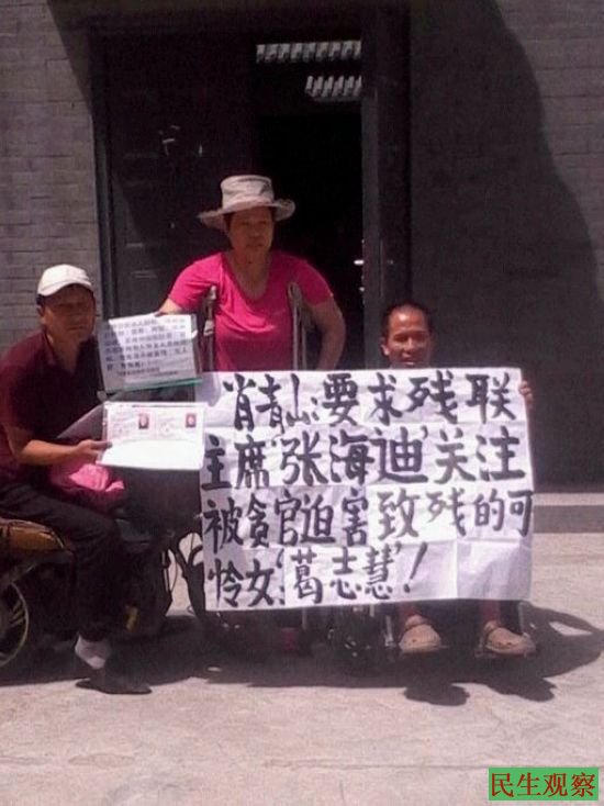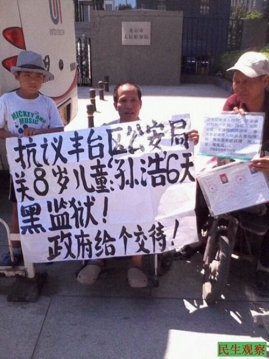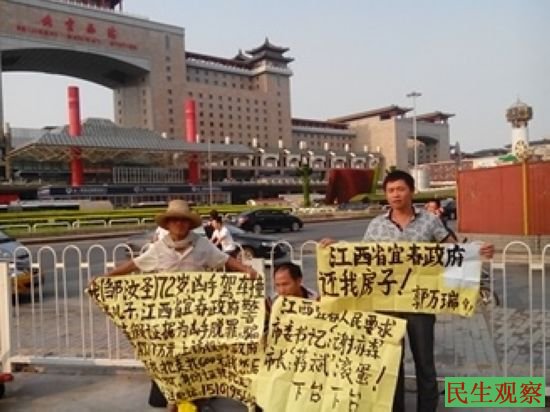 民生观察工作室2013-8-2消息:今天上午多名维权人士胡湘银、李会珍、郭万瑞、左凤娥、邹汝圣、殷冬根、肖青山等人,在北京西站等多处举牌抗议,要求江西宜春市委书记谢亦森,市长蒋斌下台。据悉,事件起因是由于江西省宜春市国土局地质队违规摆放变压器,导致该市市民胡湘银先生的双手严重受伤且致其终身残废,虽经多方投诉,政府部门却依然不予理会,不予以解决。另外,北京访民葛志慧,因被贪官勾结开发商非法强拆了她的房子,她去上访之时,又被开发商雇黑社会人员将其殴打致残,葛志慧8岁儿子(孙浩)也被北京市丰台区公安局关进黑监狱6天,葛志慧女士求告无门,今天也与肖青山先生他们一起,到了北京检察院等多地抗议。