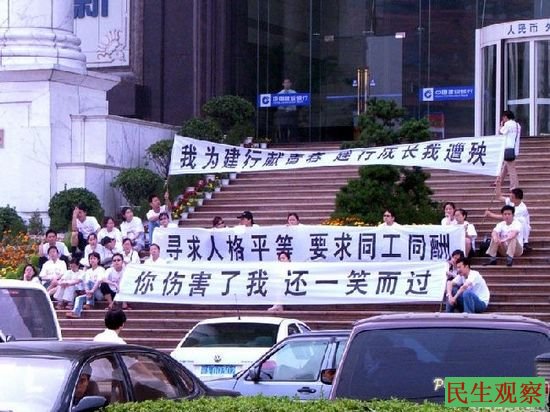 民生观察工作室2013-8-20消息:今天河南各地建设银行买断下岗职工100多人继续在河南建设银行上访请愿。由于没有任何进展,已有50多人进京上访了。
