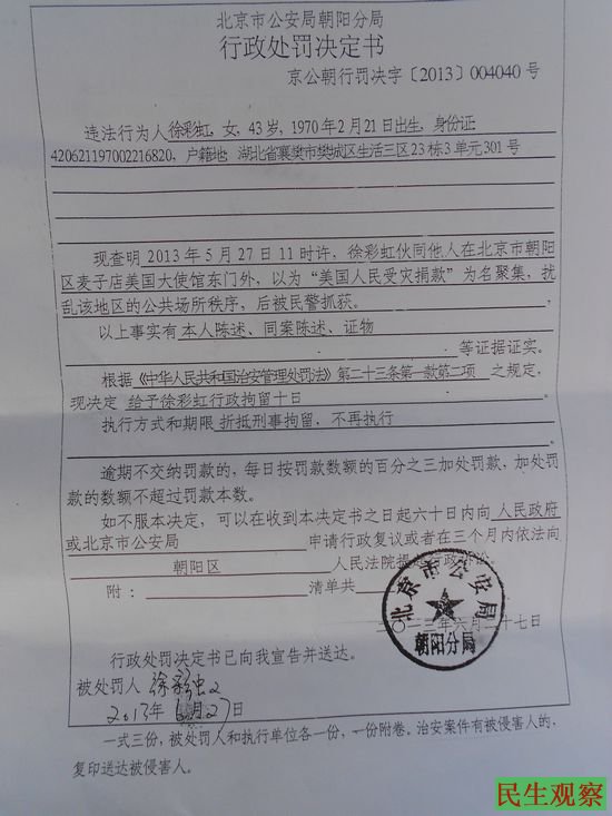 民生观察工作室2013-8-22消息:2013年5月18日至20日,美国中部多个城市遭受特大飓风和冰雹灾害,在北京有85名访民为美国灾民捐款。5月27日上午10时左右,十余名捐款访民代表将捐款送往美国大使馆。可到了北京市朝阳区麦子店美国大使馆大门外,武警和警察不让进去送捐款,叫她们在美国大使馆大门外马路对面等待,等待武警通知美国使馆工作人员出来接待。结果过会儿,等来大批警察将她们抓到麦子店派出所,朝阳公安分局以她们“伙同他人在北京市朝阳区麦子店美国大使馆东门外,以为美国人民受灾捐款”为由扰乱了社会秩序,将13名送捐款人刑事拘留31日。6月27日,徐乃来等两人被批捕,受审。