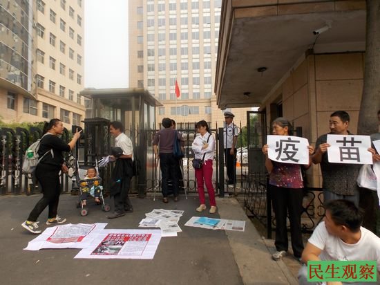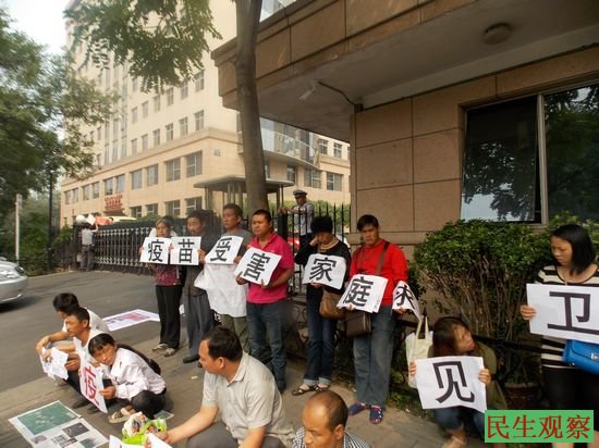 民生观察工作室2013-9-9消息:今天上午,全国多个地区的疫苗受害者家长二十多人集体来到卫生部前上访讨说法。同时,其它医疗事故受害者今天也有到卫生部前。