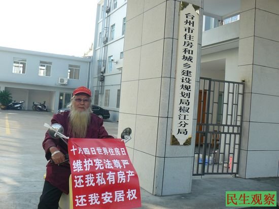 2013年10月4日,中国浙江台州经租房业主林大刚老先生在台州政府有关部门前及广场,挂标语进行抗议!“维护宪法尊严,还我私有房产,还我安居权”