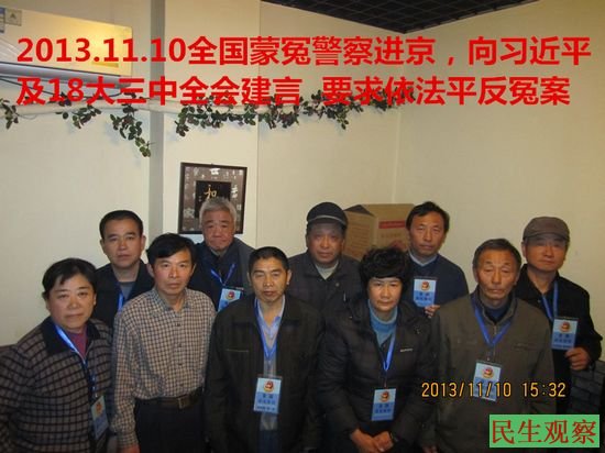 民生观察工作室2013-11-11消息:现在,中共十八届三中全会正在进行中,全国多个省市区的“蒙冤”警察进京喊冤。昨天,这批警察在北京聚会,除了表达自已的冤情外,还呼吁中央重视冤假错案的纠错与依法严惩错案、冤案的制造者,并向三中全会建言建议。