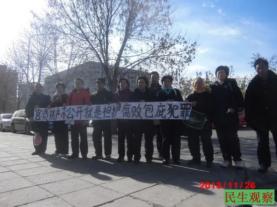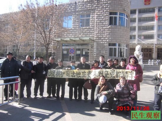 民生观察工作室2013-11-26消息:在京访民蔡志国、居小玲等人今天顶着北京3-5级的大风,在北京丰台区多处到处打横幅,他们还把横幅打到丰台区法院门口。横幅上写有“访民拥护司法独立要求纠正冤假错案”,“公民要求官员财产公开”,“官员财产不公开就是袒护腐败包庇罪犯”.