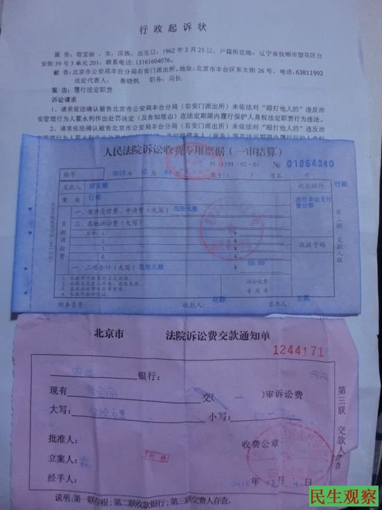 7月25日宿宝丽在南站附近开阳桥西乘坐北京公交122路车到国家信访局控告申诉,因一元钱没钱买车票而被司机冲出驾驶室拉扯、殴打后,宿宝丽打110报警,北京市公安局丰台分局右安门派出所反而将报案人(即被侵害人)宿宝丽行政拘留5日,将“殴打他人”的司机当时在派出所就放走,违反法定程序和法定职责,不处理。11月22日,宿宝丽在维权人士彭中林的帮助下,向北京丰台区法院递交了起诉状,状告北京市公安局丰台分局不履行法定职责一案,于昨日得到丰台区法院受理,交付了五十元诉讼费。