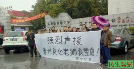 民生观察工作室2014-2-17消息,今天上午,苏州新草桥中学高中语文老师袁雪成,在寒假结束后的开学第一天,来到了苏州市新草桥中学的大门前举牌抗议,要求校方撤销不当决定,恢复他返回讲台讲课的合法权益,苏州当地的20多位公民也来到了该校门前声援袁雪成老师。