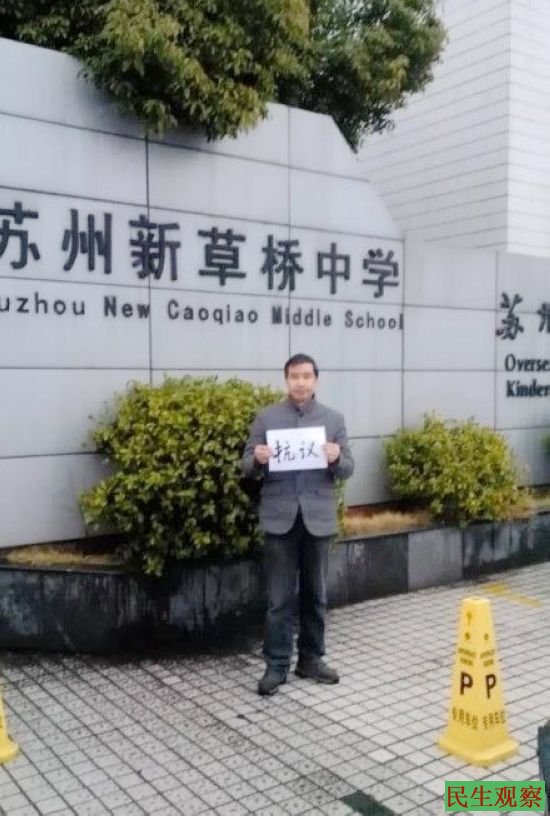 苏州教师袁雪成 开学当天在学校门口举牌抗议 |