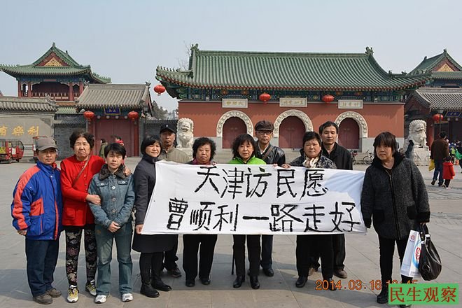 3月16日天津市的访民在天津市中心公园;天津市河北区访民在河北区大悲院缅怀曹顺利女士。