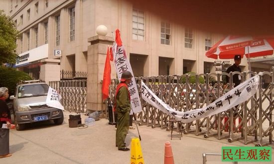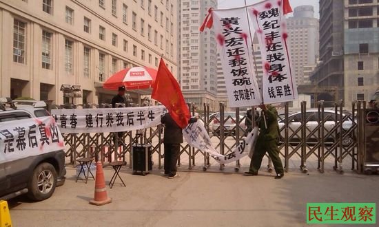 他们手举标语,悬挂横幅,上书“黄兴宏还我饭碗,魏纪丰还我身体”等内容,在省建行总部门前表达维权意愿。