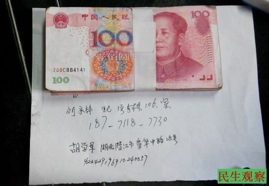 维权人伍立娟遭人强送一万元钱 上交政府无人接管 |