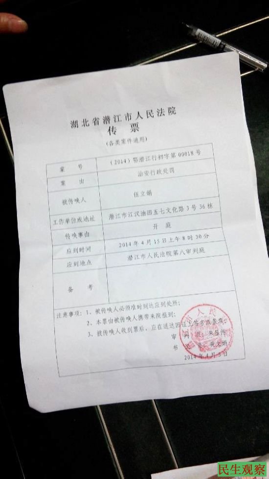 民生观察工作室2014年4月9日消息:昨天本工作室报道了湖北潜江维权人伍立娟,遭政府安排的不明身份人员与之交涉一事。详见《潜江市政府安排不明身份人员 与维权人伍立娟交涉》http://aaa.aetdhfjgk.cf/a/lanmu1/2014/0408/9702.html