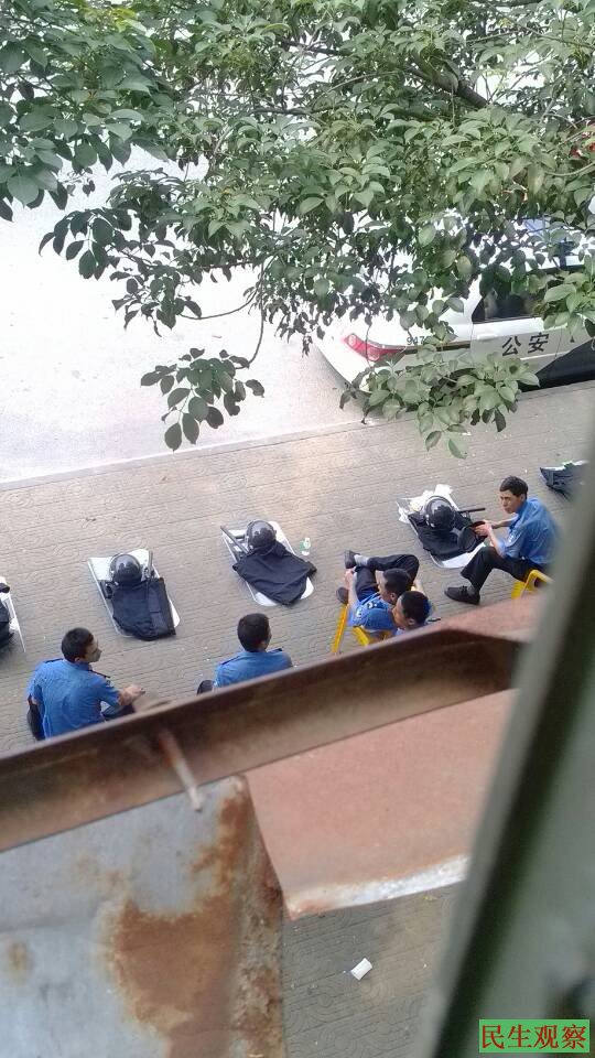 民生观察网2014年4月18日:东莞市高埗镇裕元六厂的工人持续罢工,但今天并未上街和聚集,厂区四周有大批特警、治安员和狼犬。中午十一点多工人陆续走出工厂,四周蹲守的政府警卫人员全体起立,手持盾牌、警棍、头盔。