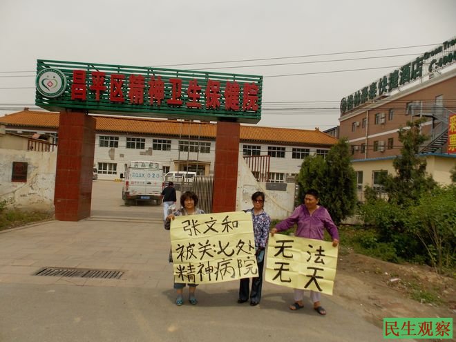 今天上午,北京维权人士王玉琴、王学勤、张秀华、徐永海再次来到昌平区精神卫生保健院,要求见张文和,结果再次被医院拒绝。无奈之下,几名看望者打出标语抗议医院“无法无天”。