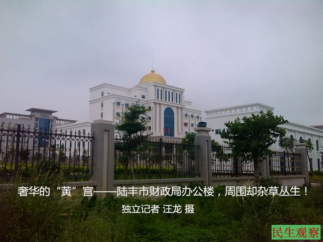 为了一睹腐败的成果——奢华的政府楼堂馆所,在此次探访之行的间隙,人权活动人士刘嘉青与独立记者汪龙一道前往位于乌坎村旁的陆丰市政府大楼外、陆丰市财政局大楼外参观。宽广的政府大院和气派的政府大楼在一大片荒凉的土地中显得十分扎眼,而“黄”宫——陆丰市财政局的大楼则是用了类似于美国国会大厦的椭圆形顶盖,显得十分奢华与霸气。但是,这些政府大院的墙外却杂草丛生;甚至于陆丰市政府对面的河堤栏杆,也仅仅只修了陆丰市政府对面几十米的一段,而旁边的河段却没有任何栏杆;与此相对应的还有陆丰市其它路段坑坑洼洼的道路以及十分不完善的基础设施。