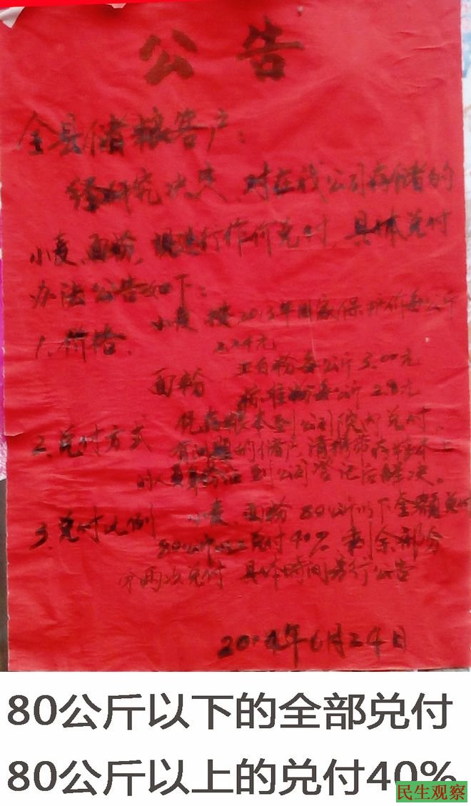当地老百姓维权,厂方贴出告示称,“80公斤以下的兑付40%,80公斤以上的另行通知”。该告示被老百姓撕掉,老百姓愤愤不平称此是骗人招数。在多次找到县信访局、县粮食局后近两天开始了“80公斤以下的全部兑付,80公斤以上的兑付40%”。