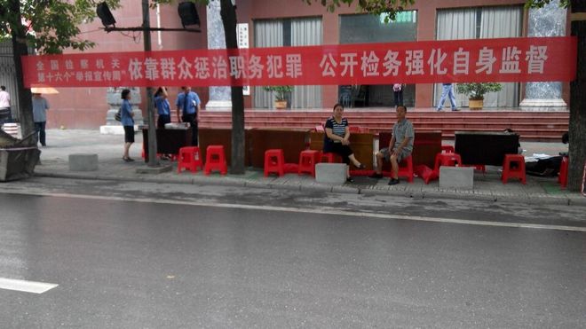前来“作秀”的干部领导不少,有湖北仙桃检察院的领导,桌子上的牌子放了很多,有检察长,副检察长,督查组长,反腐检察长,反腐副检察长,还有潜江市检察院,反贪局局长杜飞,控申科科长李群梅,仙桃中院副检察长赖局长,不知道她的名字问了也不说,昨天的群众不多就我们几个人,如果没有我们几个人可能会“冷场”。因为去年全国检察院接访宣传日在潜江市进行时,就在检察院门口有访民被打伤,可能是因为这个原因吧来的人不多,仙桃检察院副检察长第一个接待彭峰,第二个接待伍立娟,接待我时我笑着说今年不会打我们吧,我说我们是女的经不起你们“黑打”,他们都看着我笑了。