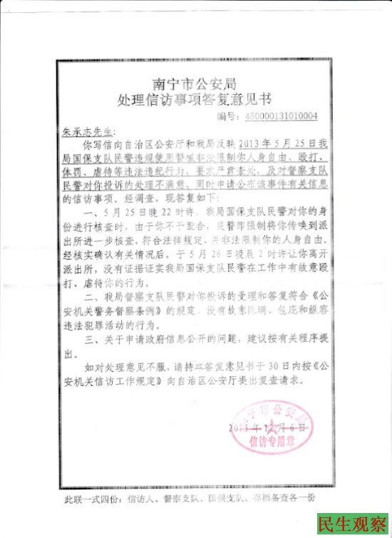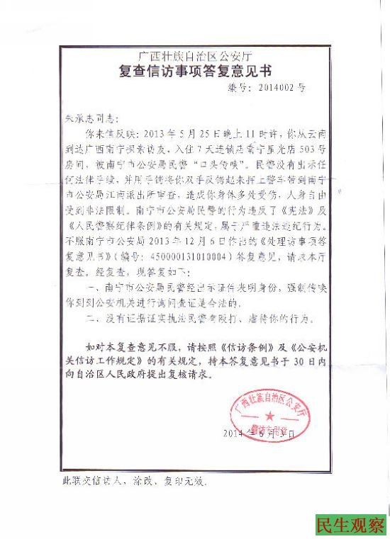 民生观察工作室2014/7/21日消息:公民朱承志就被广西南宁警方无辜殴打一事向广西壮族自治区政府提出复查申请书,依法请求追究被申请人滥用职权殴打虐待他的南宁警方相关责任人,并请求撤销“广西壮族自治区公安厅复查信访事项答复意见书,编号:2014002、南宁市公安局处理信访情况答复意见书,编号:450000131010004”这两份完全不顾真实情况的意见书。