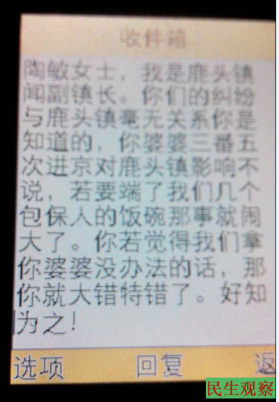 短信中说:“陶敏女士,我是廘头镇闻副镇长,你们的纠纷与廘头镇豪无关系,你是知道的,你婆婆三番五次进京对廘头镇影响不说,若要端了我们几个包保人的饭碗那事就大了,你若觉得我们拿你婆婆没办法的话,那你就大错特错了。好自为之。”收到短信后,陶敏急忙到北京寻找婆婆。