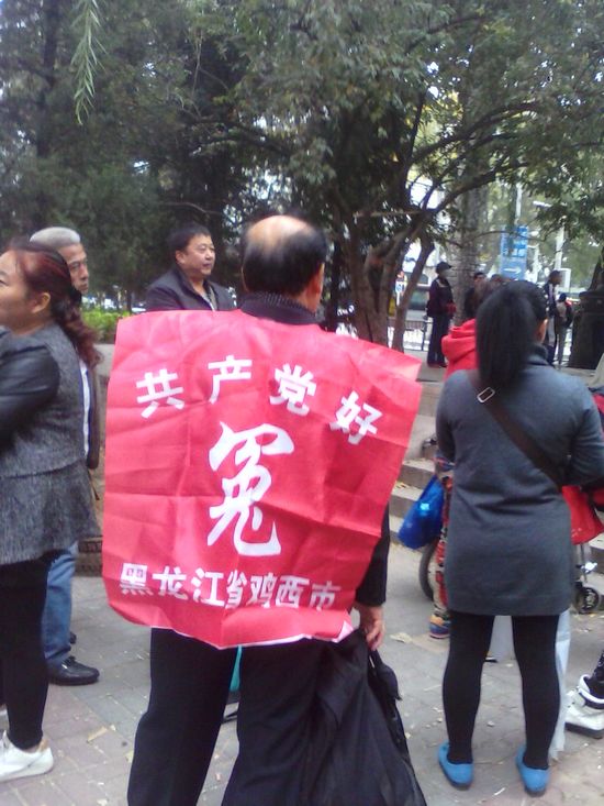 黑龙江鸡西市的15个访民来的稍微晚了一步没赶上拘留,有几个人就穿上状衣,准备拍照,警察和保安冲过来把状衣给他们撕了下来,其中一访民受惊晕倒在地,警察和保安见状也不在纠缠,纷纷离开。