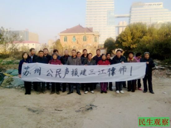 综上所述,昨天下午,苏州二十余位维权人士开始在一处拆迁工地,拉起条幅声援黑龙江“建三江案”的律师维权。维权人士们表示:为了执政党自身的形象,更为了响应中共十八届四中全会“依法治国”的号召,全国人大常委会、最高检察院、公安部、司法部、全国律协都应该出面对黑龙江建三江地方当局非法关押公民的黑监狱和对维权律师进行非法抓捕、殴打、拘留的问题进行联合调查,切实依法进行处理,并且举一反三,对全国的同类问题制定强有力的遏制对策,通过加强法治、确保人权来杜绝黑监狱的产生和对人权律师的公然迫害。对于“建三江案”必须有一个合理、合法、公开的审理过程,给全国公民一个迟到的正义和交代!