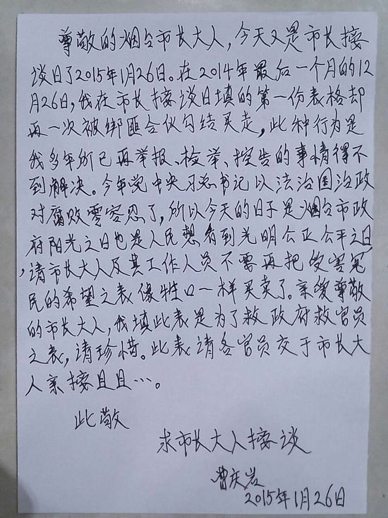 烟台市长接待日 曹庆岩控诉其为假大空作秀 |