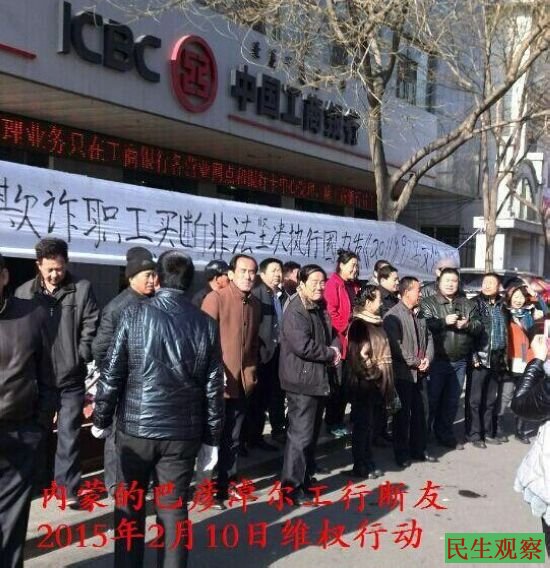 民生观察工作室2015-2-10消息:再有几天就是春节了,有多地的银行买断工龄人士,在昨天和今天开始到各省银行总部去拉起横幅坚决维权。据湖北潜江银行买断工龄人士伍丽娟消息称,今天湖南工行有20多人在省工行拉横幅维权,湖北也有多位银行买断工龄人在北京维权,但随后他们被抓进了马家楼关押。还有,内蒙许多的银行买断工龄人士,从昨天至今天一直坚持在分行总部拉横幅控诉维权。
