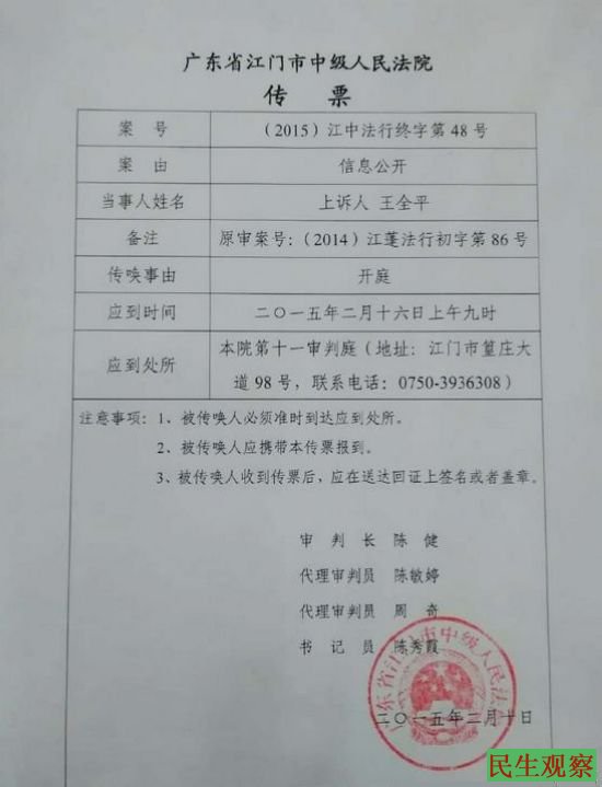 民生观察工作室2015-2-16消息:今天上午,维权律师王全平起诉江门司法局,要求其信息公开案二审在广东省中级人民法院开庭。