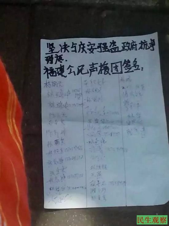 民生观察工作室2015-5-13消息:今天上午,维权人士柴先生在路过福建省高院时,看到数十名访民在集体抗议,他们打出各种标语抗议地方政府的侵权迫害行径,并声援黑龙江庆安遭警察枪击身亡公民徐纯合,谴责安庆恶警李乐斌。