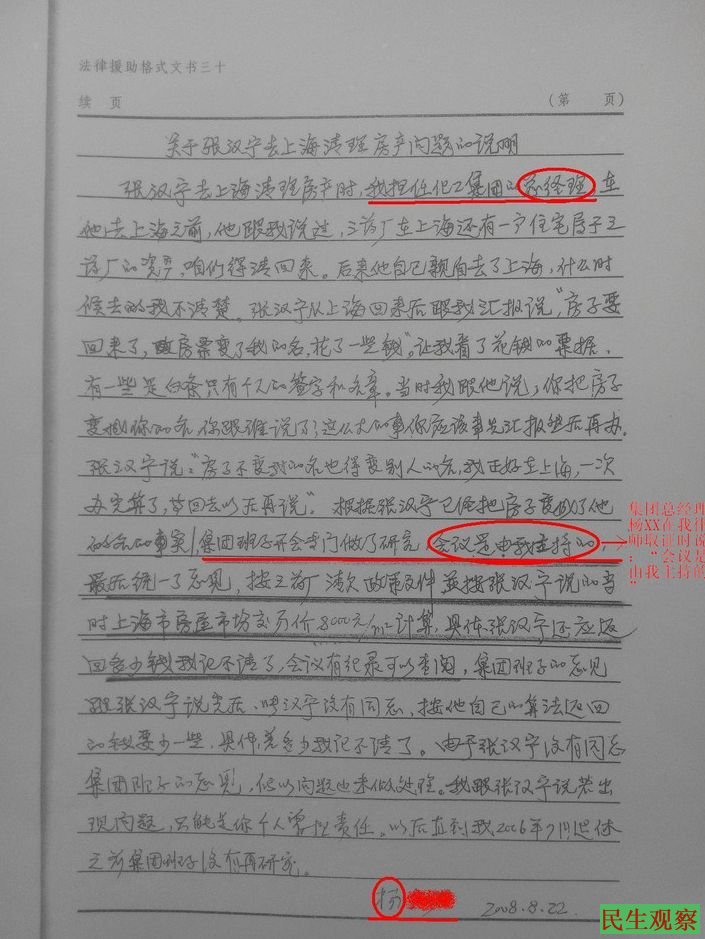 张汉宁讲述,2004年时他担任本溪第三制药厂(留守)书记兼厂长。该厂座落于本溪市溪湖区,隶属本溪化工集团。2004年,经化工集团领导同意,他到上海清欠回一户房子。当时三药厂营业执照己被吊销,办理房子变更登记时,无法变更到三药厂名下,只好暂时过户到他名下。房子清回后马上交给化工集团处理,集团班子经研究,决定按照三药厂《关于清收帐款和提成的规定》将房子卖给他,并抵顶垫付款和提成。他根据集团决定,于2007年9月前将房款全部交清,垫付款分文未报。