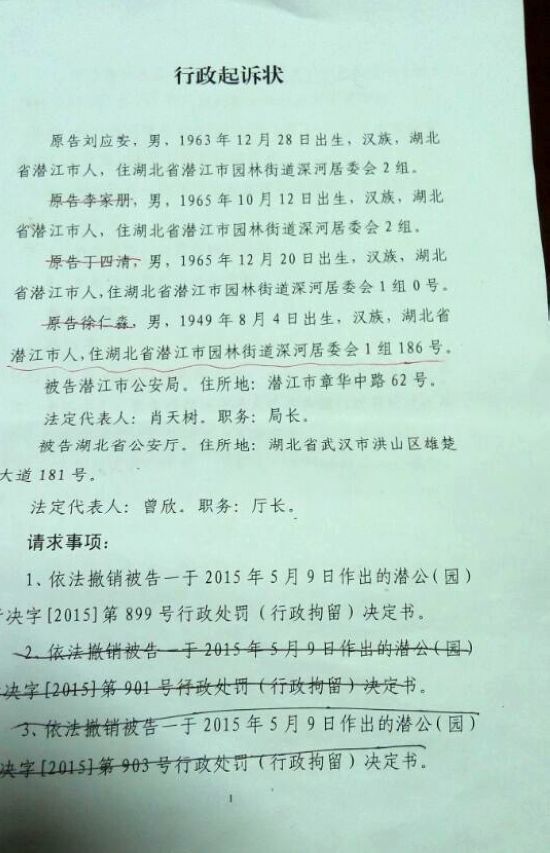 湖北潜江访民刘应安诉市公安局长一案今日下午开庭 |