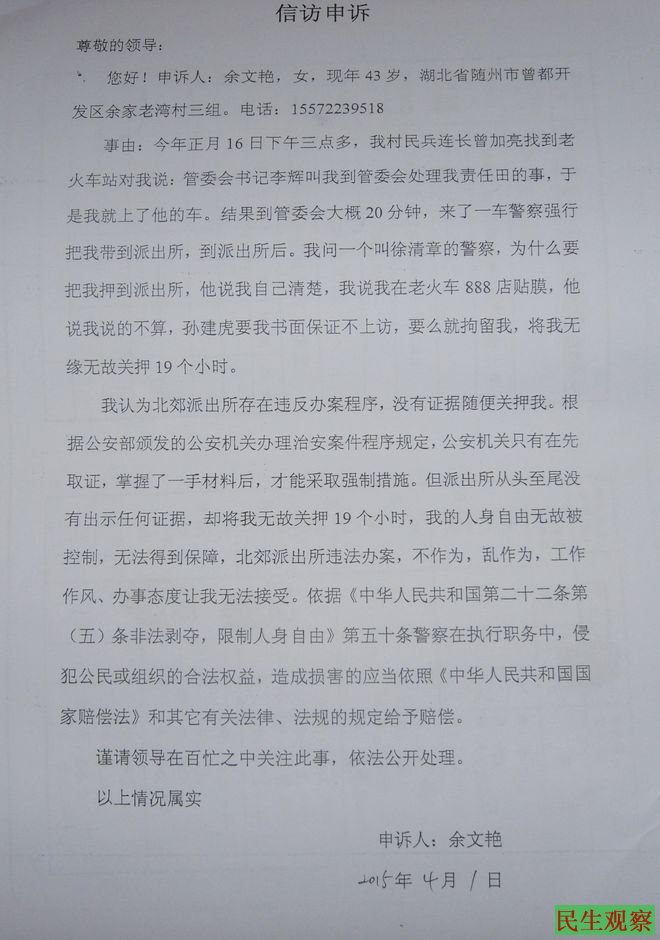 余文艳是湖北省随州市余家老湾村三组村民,因自家猪圈被邻里而毁,及自家农田排水受阻而上访。今年两会期间的3月6日下午三点多,余文艳到随州老火车站(现已无客车营运)一家名为888店准备干帖膜的活。结果被维稳人员知道她到了火车站,可能又要去上访。随即,村民兵连长赶到火车站将余文艳带上车,说是到曾都开发区谈她的问题,但最终余文艳被带到了北郊派出所,在这里余文艳被关了整整九个小时。