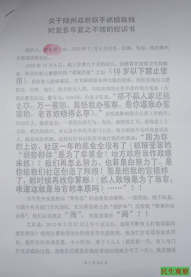 李冬琴的诉求书
