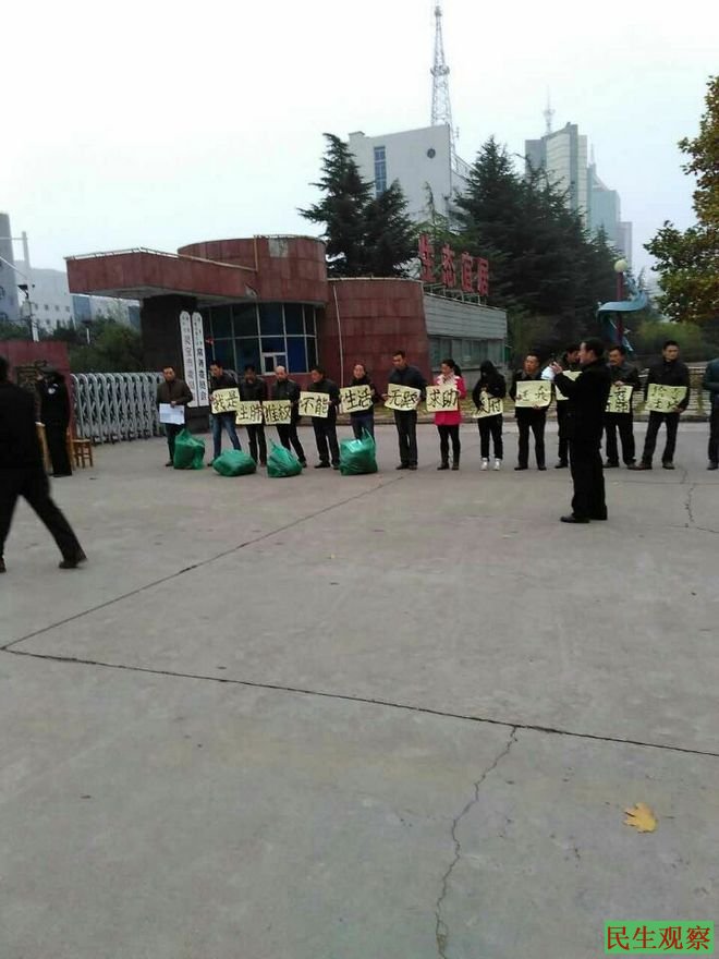 民生观察工作室2015/11/19消息:今天上午,在河南省灵宝市政府门前,数十名尘肺病患者举着标语和牌子抗议讨说法。