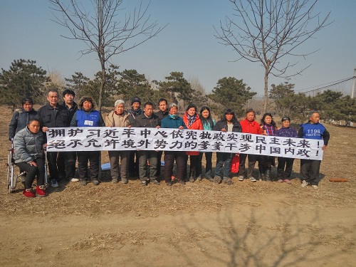 民生观察工作室2016/3/2消息:明天,就是全国两会召开的日子,许多具有不同国籍的与会代表也以陆续到京准备参会。全国在京访民为了表达爱国之情,支持习总书记依宪执政,实现民主未来,以张打横幅的方式,反对外国势力进入中国两会搅局,干涉别国内政。