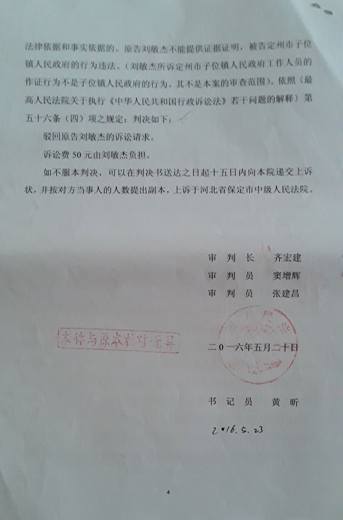 河北定州访民刘敏杰诉定州市政府违法被驳回 |