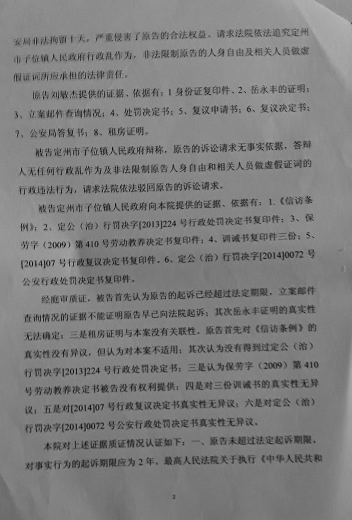 刘敏杰说,这是明显的枉法裁判,我的案件在北京,我也居住在北京,我控告的是最高人民法院,定州市任何部门对我没有管辖权,即便是我违法了,根据属地管理的原则也是由北京市公安局来管,轮不到地方插手。即便就是因上访被北京警方训诫了也不能证明我违法,北京公安提供的训诫书只能证明我没有违法,公安局也没有证据证明我违法的具体地点及违法行为后果的证据,他们所谓的我违法的证据就是训诫书、劫访人员在久敬庄把我接回来的证言。庭审的时候我一再要求他们拿出我违法时的影像证据他们没有,要求出示拘留所的监控记录他们也没有,法院只听信他们一面之词。
