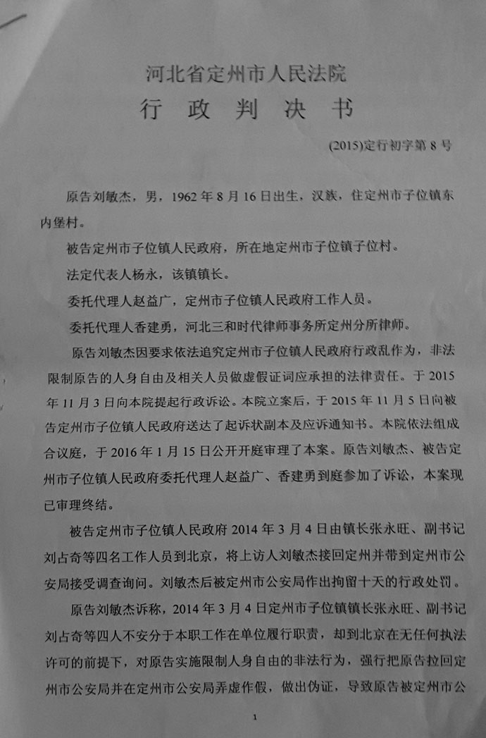 民生观察工作室2016/6/9消息:河北定州市访民刘敏杰诉定州市子位镇政府非法劫访,限制人身自由和诉定州市拘留所殴打并克扣被监管人员伙食、不给发放释放证及诉定州市公安局违法行政拘留的3个行政案件,5月20日被定州市人民法院以所诉不实为由全部驳回起诉。