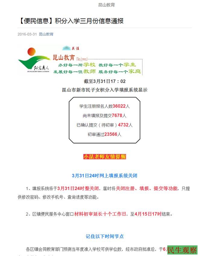 三月份,昆山市教育部门公布了初审通过的新市民子女学生人数为23566人。6月30日,昆山市教育部门又公布昆山积分入学可提供18209个学位(