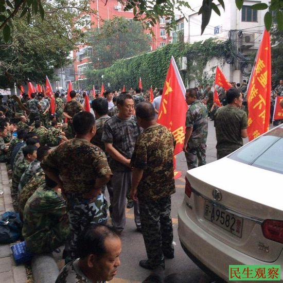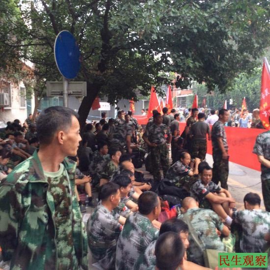 民生观察工作室2016/7/18消息:今天来自全国各地的5000名退伍老兵聚集在中央军委信访室集体维权请愿。许多警察和特警围堵在周围要强行清场,在老兵们的强烈抗议下一直坚持到晚上7点才被陆续押上车送到北京市通州区的一个救助站。