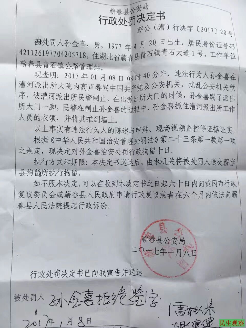 据悉,今年1月6日,孙德胜被国保警察从广州带回蕲春,软禁在当地一家宾馆内。得知弟弟已返乡但多日未到家,孙金喜于1月8日上午到漕河派出所询问,但对方拒不说明超期羁押孙德胜的理由。