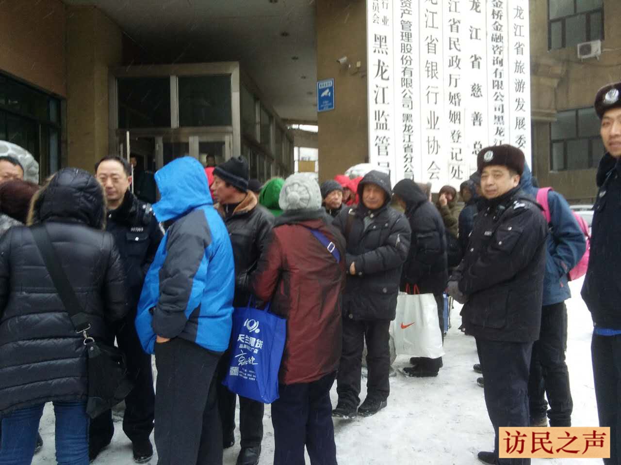 [访民之声2017/2/22消息] 昨天露宿在黑龙江银监局门外的四大银行断友被数十警察驱散,今天百余断友仍坚持在银监局维权,但银监局拒绝他们入内反映诉求。