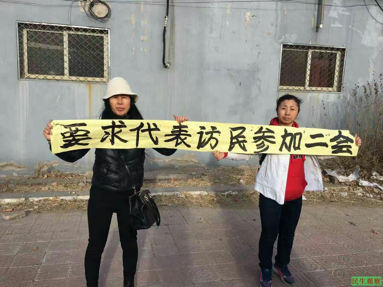 今天早上,正在北京上访的老牌访民广州的李小玲(上访12年)和吉林延边的闫春凤 (上访六年)一起在北京暂住地打出“要求代表访民参加两会” 的牌子(图一),并在微信微博账号上发布(图二),呼吁朋友们支持 ,获得大量点赞和转发 。