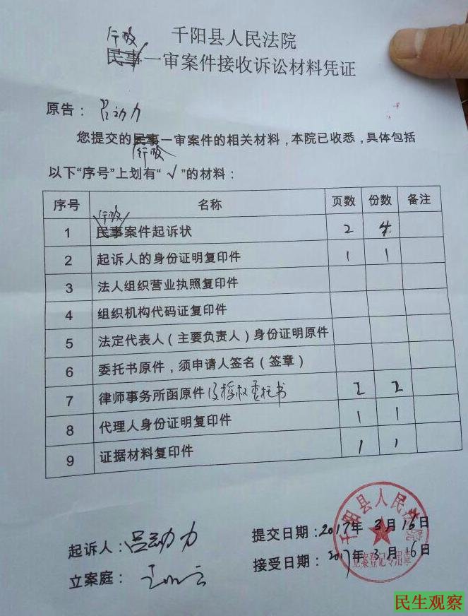 据悉,今天(3月16日)下午,余文生律师携同当事人吕动力来到千阳县人民法院递交行政起诉状,正式起诉千阳县公安局,目前法院已经签收行政诉状和其他诉讼材料。
