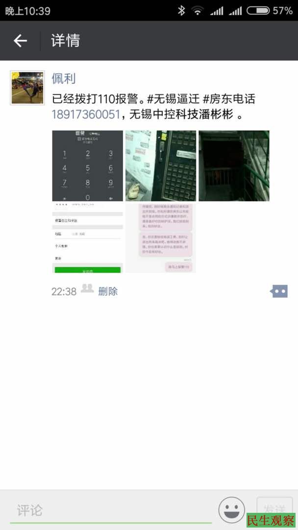 “无锡110警察不但不为我解决问题,反而态度蛮横训斥我,然后他们便扬长而去。”佩利说“房东无锡中控科技潘彬彬的电话18917360051现在已无法接通。我又拨打督察电话举报两个110警察态度恶劣不作为。督察有训斥了我一顿,说我不懂法,两个110警察虽然态度不好,但他们做的是对的。”
