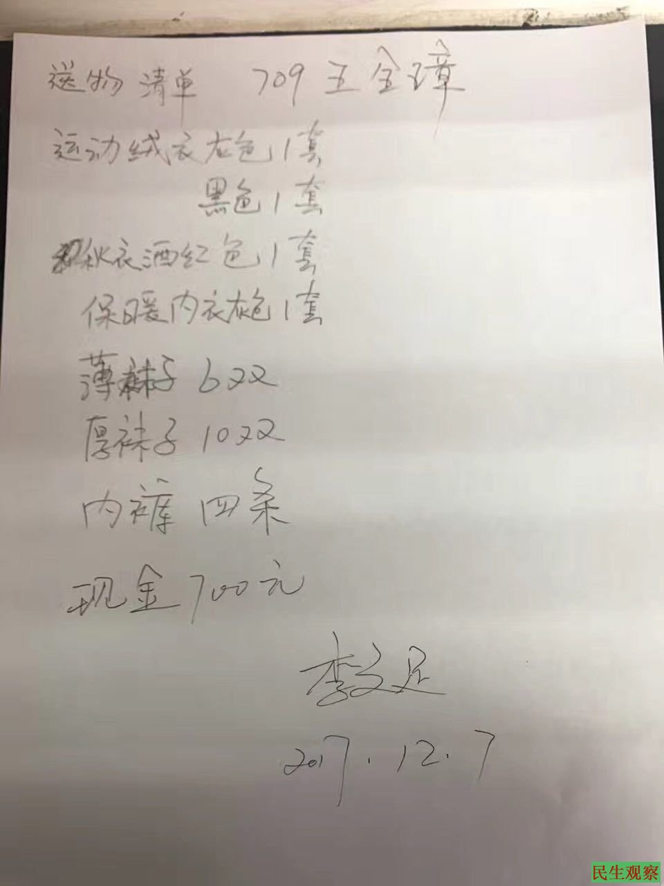 【民生观察2017年12月8日消息】本网获悉,昨天上午,“709案”王全璋律师的妻子李文足去到天津第一看守所,首次成功为被羁押两年多的王全璋律师存钱存衣物。事后李文足表示,她不知道王全璋能否收到。