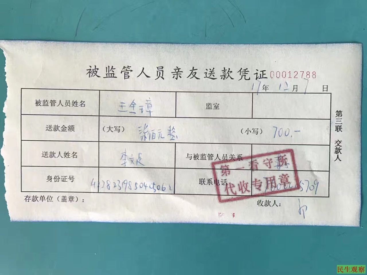 李文足与王峭岭在等候大约半小时后,看守所派出一名女警出来接待,要求李文足将要送的钱物写了一份清单后,接收了钱物,出具了收款凭据。当时,李文足向该女警提出要求称,是否可以让王全璋写个纸条,家属想确认王全璋收到衣物和钱。女警表示此要求没法做到,随即离开。