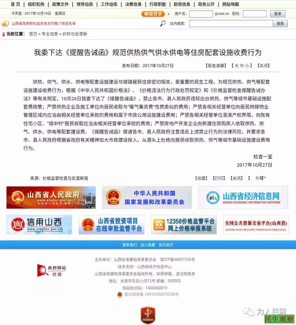 关于冬季供暖需缴纳“暖气接口费”问题,多年来在全国范围内各城市居民已成为一个引发广泛不满的话题。价格监督检查与反垄断局在今年10月27日曾发文名为规定:“供热、供气、供水、供电等配套设施建设与城镇居民住房密切相关,是重要的民生工程。为规范供热、供气等配套设施建设收费行为,根据《中华人民共和国价格法》、《价格违法行为行政处罚规定》和《价格监督检查提醒告诫办法》等有关规定,10月26日我委下达了《提醒告诫函》,禁止各市、县人民政府违规出台供热、供气等城市基础设施配套费政策;严禁供热企业及施工单位向居民收取与“暖气集资费”性质类似的费用;严禁各相关经营单位向居民转嫁物业管理区域内应当由相关经营单位承担的费用和属于市政公用设施建设费用;严禁各相关经营单位混淆产权界限,向既有住宅小区、“城中村”居民收取应当由相关经营单位承担的费用;严禁房地产开发企业向新建住房购房人收取供热、供气、供水、供电等配套建设费。《提醒告诫函》提请各市、县人民政府注意违反上述禁止行为的法律风险,并要求各市、县人民政府根据省政府有关精神加大市政建设投入,从源头上杜绝向居民收取供热、供气等城市基础设施建设费用行为。”
