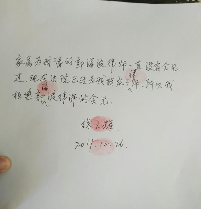 2017年12月23日,郭海波律师与同案嫌疑人李华的辩护人罗韬一起,在从成都赶往云南凤庆的途中,收到了凤庆法院的电话通知,说是被告人不要家属请的辩护律师了,并把相关通知和徐之辉的手写材料发到了律师的邮箱里。