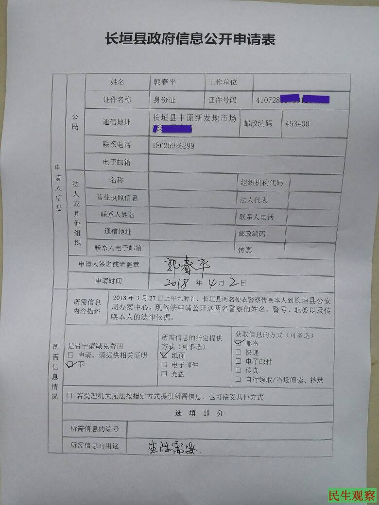继上次报警一周后的今天(4月2日)中午,河南维权人士郭春平就上个月(3月27日)被长垣县国保队长陈雪、牛姓教导员无端殴打,报案后常村派出所王警官不依法给报案人“案件受理回执”的事情,向长垣县公安局快递邮寄了两份信息公开表。随后,郭春平再次拨打电话联系长垣县110,反映3月27日被国保殴打的遭遇及索要“案件受理回执”。110警察说他们只管当天的报警,受理回执还得找常村派出所。